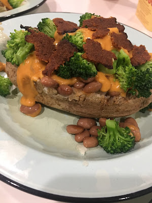 -Slice skin off from top of potato. Mash the inside. Pour on hot beans with its own sauce, then top with cheese sauce, broccoli, and vegan bacon...or whatever toppings you are craving :)